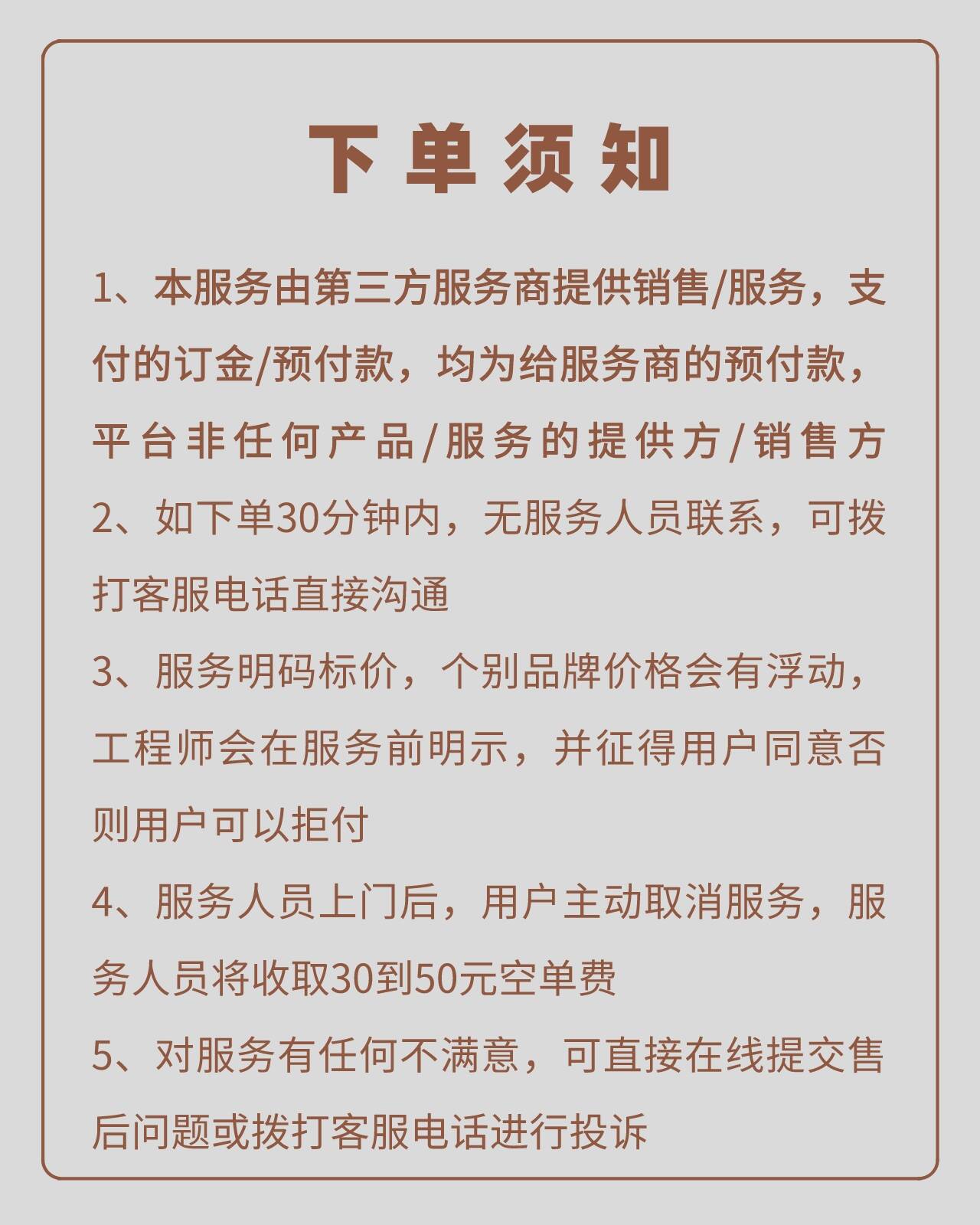 1、个别品牌价格会有浮动,最终价格有所差异,但均需在维修前明示,并征得您同意,否则您可以拒付。2、 以上费用均不包含搬运费、运输费等; 3、工程师上门后,因用户原因放弃维修,需支付上门费,但不允许超出平台上门费收费标准。